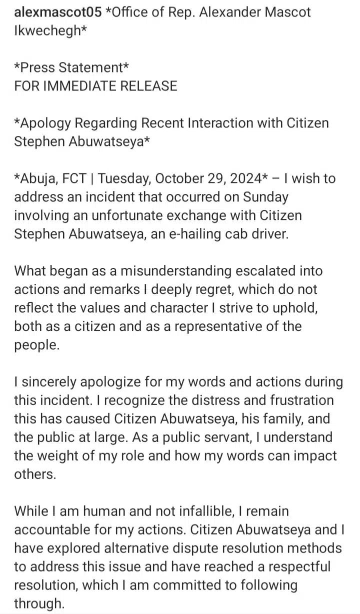 Honourable Alex Ikwechegh has tendered a public apology after being dragged over assaulting a cab driver.