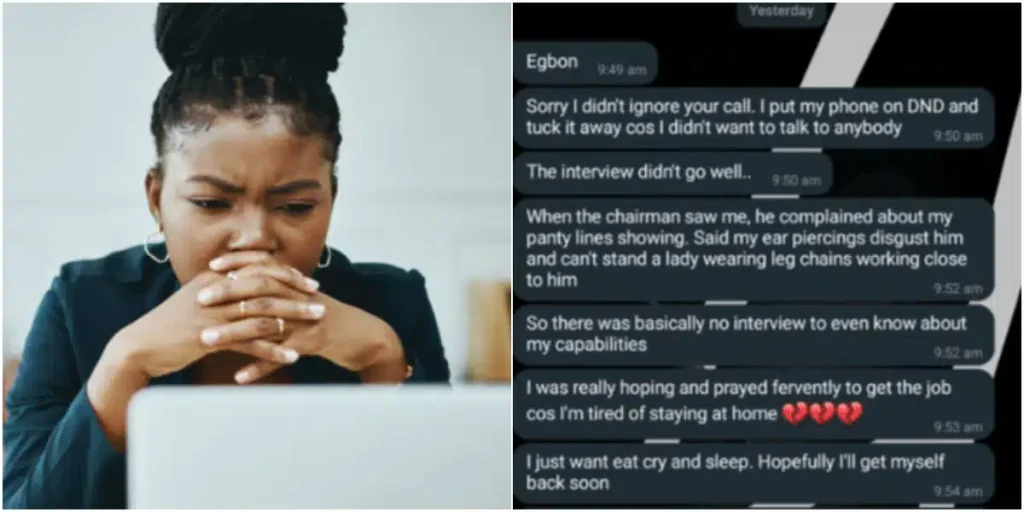 Nigerian lady has reportedly lost a promising job opportunity after appearing at an interview with multiple ear piercings and a leg chain.