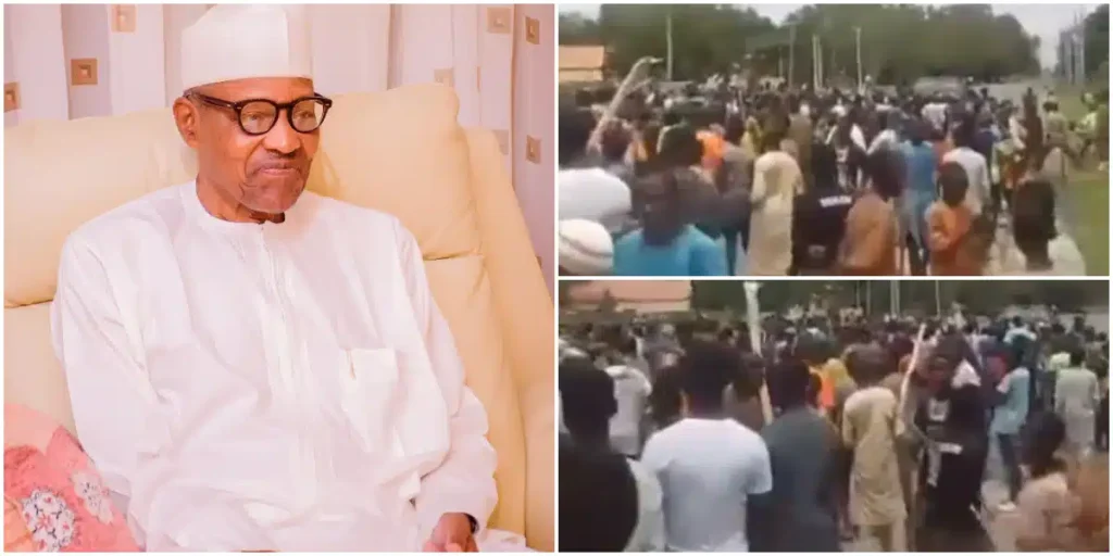 In a video circulating online, protesters are seen storming the residence of former President Muhammadu Buhari in Daura, Katsina State, creating a dramatic scene