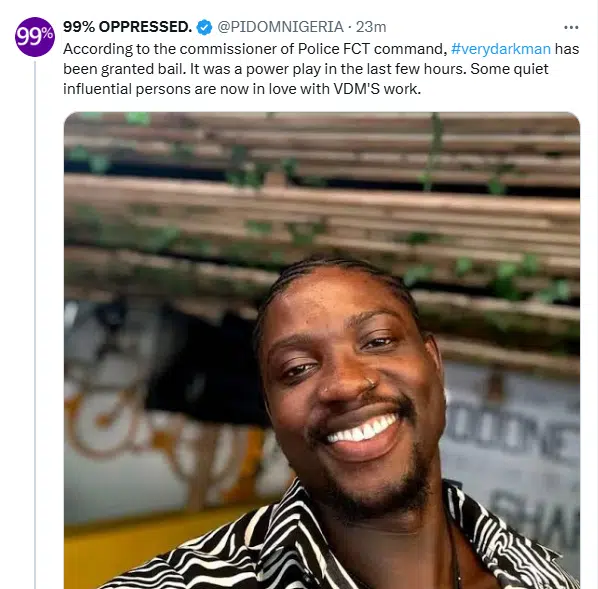 “According to the commissioner of Police FCT command, #verydarkman has been granted bail. It was a power play in the last few hours. Some quiet influential persons are now in love with VDM’S work.”