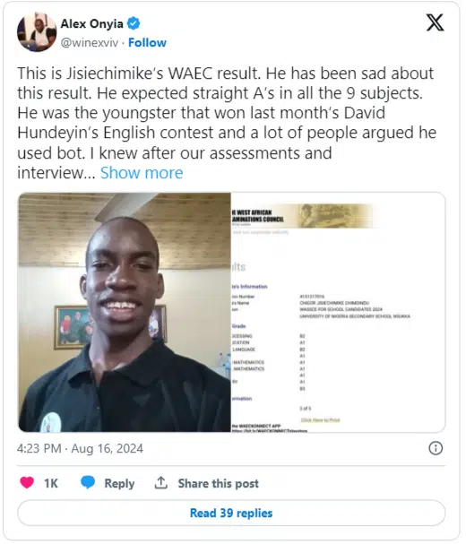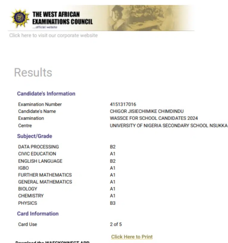 The WAEC result of Jisiechimike Chigor Chimdundu, son of a University of Nigeria, Nsukka (UNN) professor, has surfaced online after he checked his 2024 West African Examinations Council (WAEC) results, sparking waves of discussion.